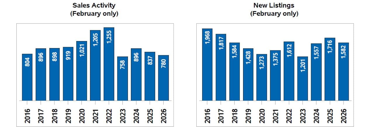 Realtors sold 780 homes in February. While that was higher than January’s transactions, it was down almost seven per cent from the same month last year and almost 18 per cent below the 10-year average.