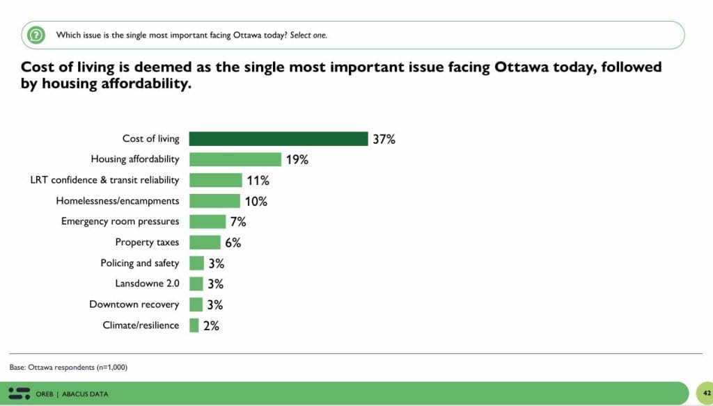 David Coletto, founder and CEO of Abacus Data, said the cost of living, housing affordability and the reliability of services, in that order, topped the concerns of Ottawa respondents to a December survey conducted by Abacus Data for OREB.