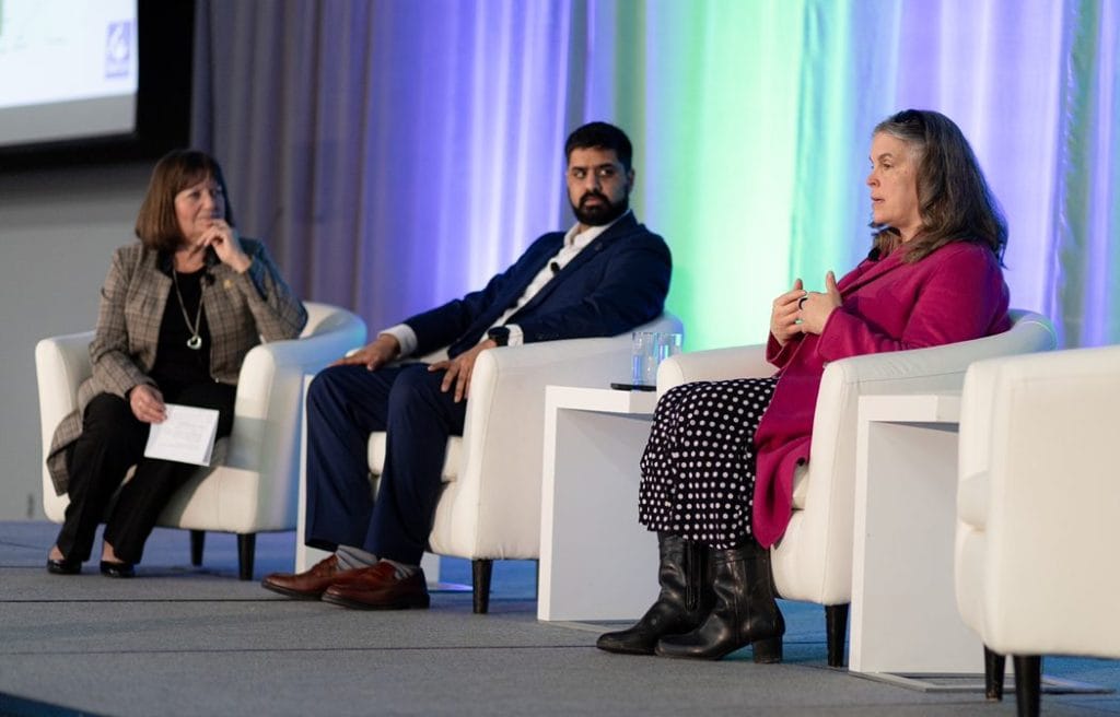 Pauline Auger, left, moderates the conversation with small-town mayors Justin Towndale (Cornwall) and Nancy Peckford (North Grenville). Photo: Ottawa Real Estate Board